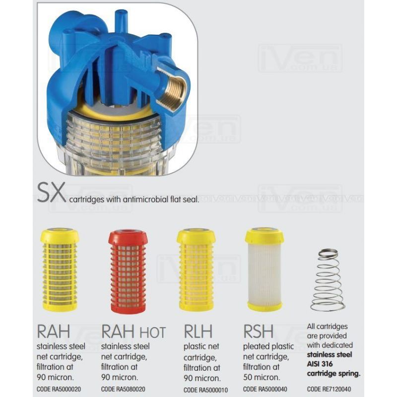 Моделі RLH з сітчастим картриджем з пластика 90 мікрон. Патрубки ВХ./ВИХІД. розміром 1/2 ", 3/4", 1 ", 1-1/4", 1 1/2 "з циліндровим різьбленням (BSP) з латуні або пластику; моделі з конічною різьбою (NPT) з пластика розміром 3/4 "і 1". Пропускна здатність 3000-10000 л/год. M-моделі з двома манометрами. MP-моделі з пластиковими патрубками ВХ./ВИХІД. із зовнішнім циліндровим різьбленням (BSP). Самоочищаються фільтри HYDRA HOT для фільтрації гарячої води зі спеціальним картриджем RAH HOT. Самоочищаються фільтри HYDRA K з латунної головкою. Всі моделі обладнані зливний лійкою для захисту питної води від рефлюксу, відповідно до стандарту UNI EN 1717-11/2002.